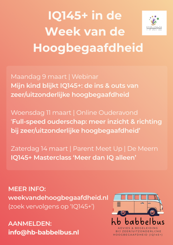 ‘Help, mijn kind is IQ145! Wat nu?’ Persoonlijk advies en begeleiding voor ouders die ontdekken dat hun kind zeer/uitzonderlijk hoogbegaafd is.