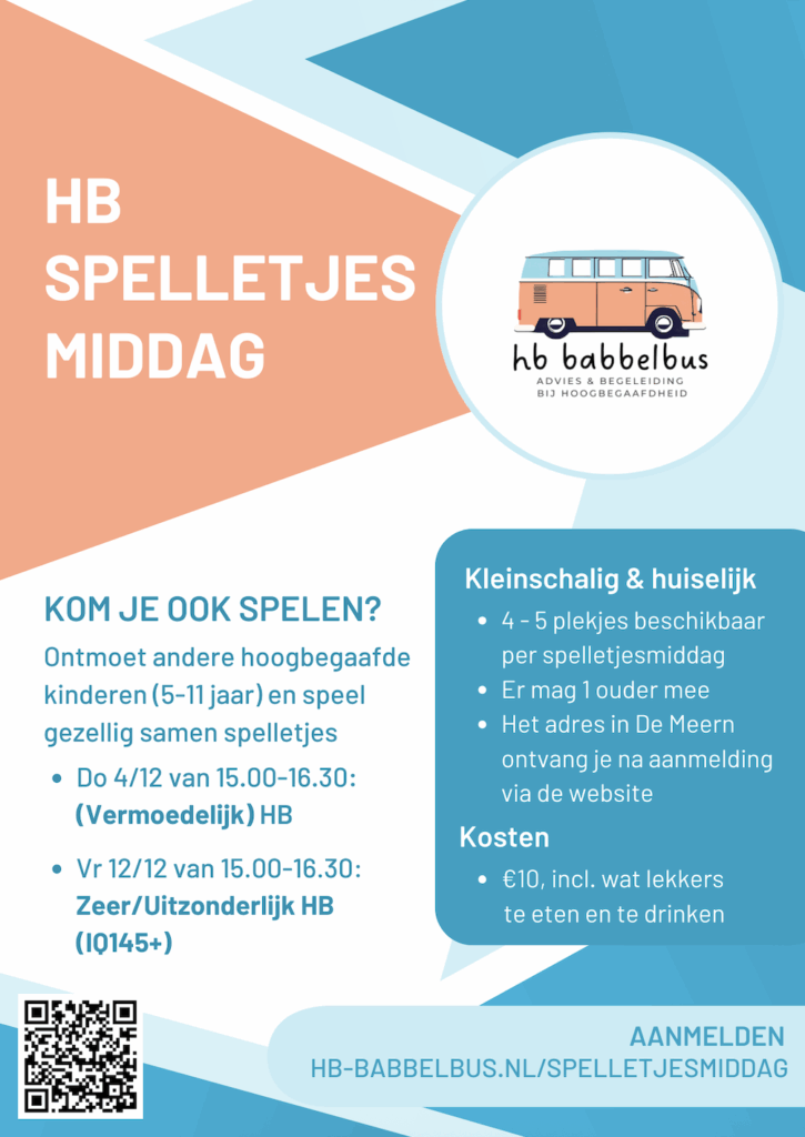 Kom gezellig spelletjes spelen en ontmoet andere (vermoedelijk) hoogbegaafde op de HB spelletjesmiddag. Voor zeer/uitzonderlijk hoogbegaafde kinderen (IQ145+) is er de IQ145+ spelletjesmiddag.